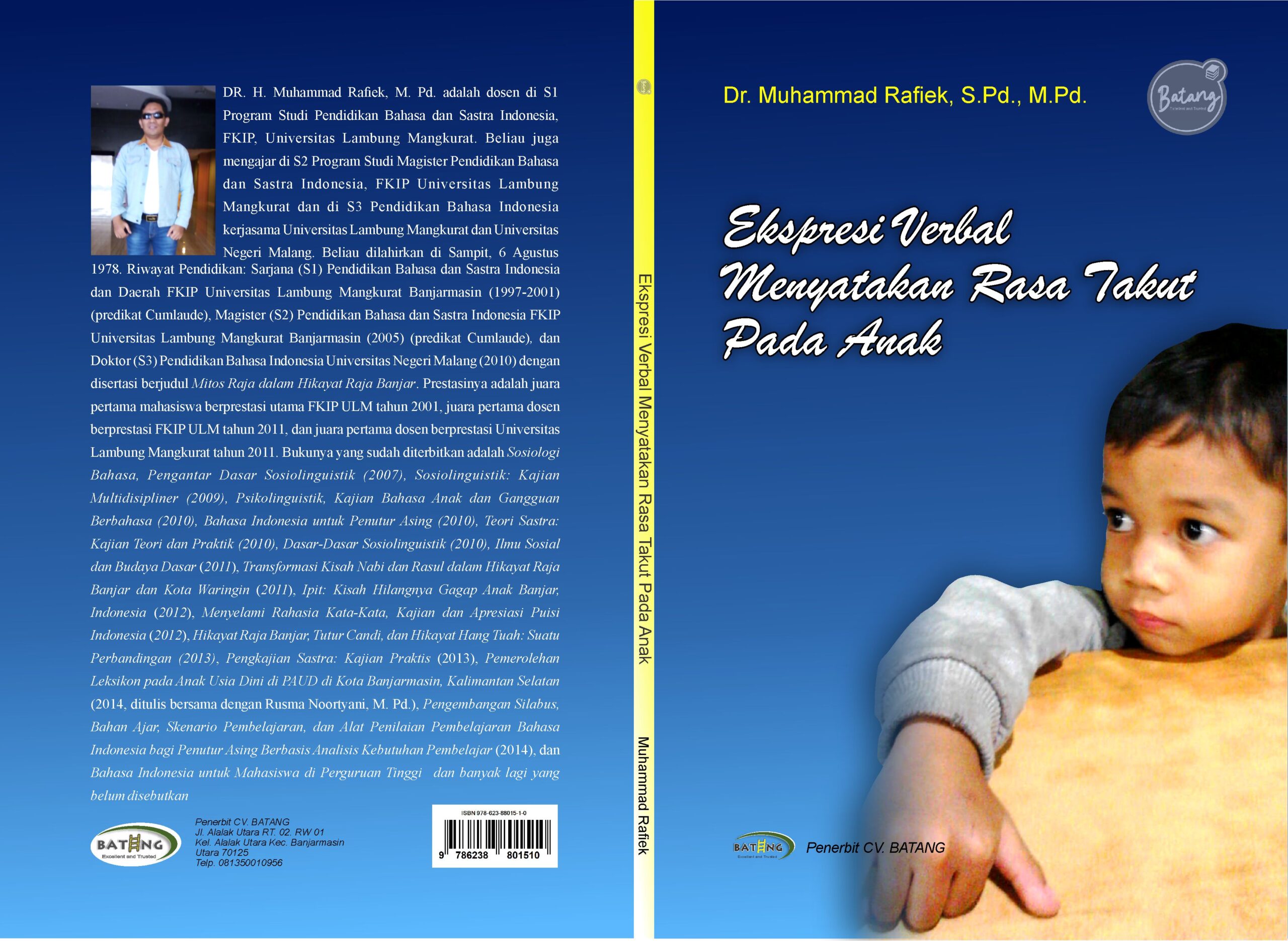 Buku ini adalah buku ajar tentang ekspresi verbal menyatakan rasa takut oleh Muhammad Zaini dari usia 2 tahun 11 bulan sampai 3 tahun. Buku ajar ini bertujuan untuk mendeskripsikan dan menjelaskan tentang ekspresi verbal menyatakan rasa takut oleh Muhammad Zaini dari usia 2 tahun 11 bulan sampai 3 tahun. Teori yang digunakan dalam buku ajar ini adalah teori kaidah struktur frasa dari Noam Chomsky (1957). Buku ajar ini berisi temuan kaidah kalimat ekspresi verbal menyatakan rasa takut pada anak laki-laki usia 2 tahun 11 bulan sampai 3 tahun yang paling sering, yaitu Nomina (N) mendahulu Adjektiva (Adj), Verba (V), dan Adverbia (Adv). Jadi, konstruksi kalimat ekspresi verbal menyatakan rasa takut pada anak laki-laki usia 2 tahun 11 bulan sampai 3 tahun (studi kasus pada Muhammad Zaini) memiliki (1) N + Adj + V + N + Adv; (2) N + Adj + V + N + N; (3) N + Adj + Adv; (4) N + Adv; (5) N + Adj + N + N; (6) N + Adj + N; (7) N + Adj + N +V + Kata penunjuk (Pen); (8) N + N + Adj + N + N; (9) N + Adj, Adv + N; (10) N + Adj + N + N + Adv; (11) N + Adj + N + N + Pen; (12) N + N; (13) N + Adj + N + N; (14) N + V + N; (15) N + N + V; (16) N + Adv + V + N; (17) N + Adj + N + Pen + N; (18) N + Adj + N + Pen, (19) N + N + Adj; dan (20) N + Pen + Adj + N + Pen.